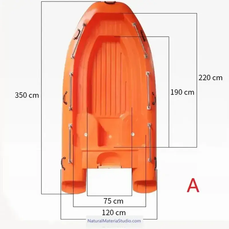 Modelo A: 3,5 metros (L) x 1,6 metros (W) x 0,6 metros (H), Peso: 125 kg, Capacidad de carga: 500 kg (3-4 adultos), apto para motores de hasta 20 caballos de fuerza.