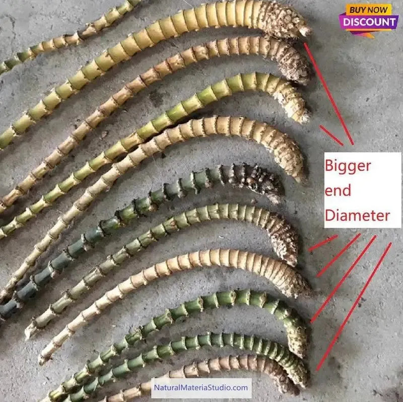 Diámetro del extremo más grueso: cada raíz tiene un extremo más grueso y otro más delgado. El diámetro del extremo más grueso varía de 2,0 cm a 4,5 cm, con una posible diferencia de 1-2 mm. El extremo más grueso se puede usar para fabricar un mango perfecto para caminar, hacer senderismo o como cuchillo, tal como se muestra en las fotos. Distancia entre nudos: generalmente de 0,1 a 0,8 cm, aunque lo más común es que oscile entre 0,2 y 0,6 cm. Todas las raíces se secan con un color amarillo. (El bambú cambia naturalmente de verde a amarillo).