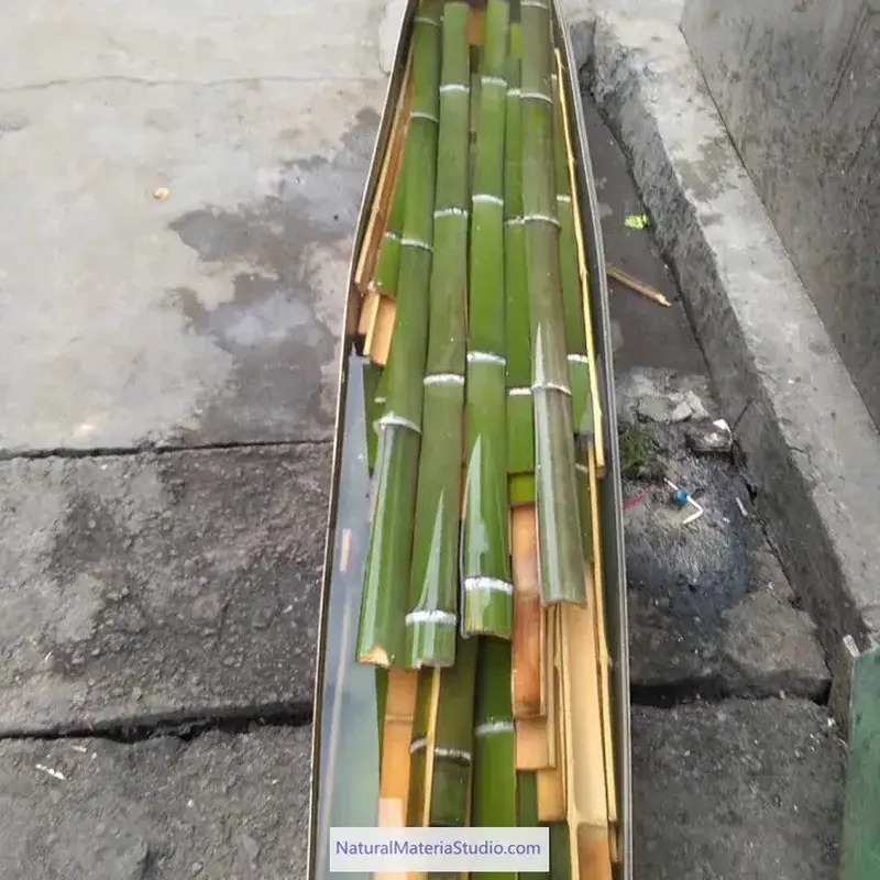 El bambú se selecciona y cosecha cuidadosamente después de las primeras heladas, luego se hierve en agua salada, se enjuaga, se semiseca y se ahúma durante unos cuatro meses bajo un denso humo natural a menos de 40 °C. Este singular proceso elimina los insectos, mejora la elasticidad y fortalece la estructura de la fibra, lo que lo hace superior al bambú secado al aire convencional que se utiliza en las reproducciones modernas.
