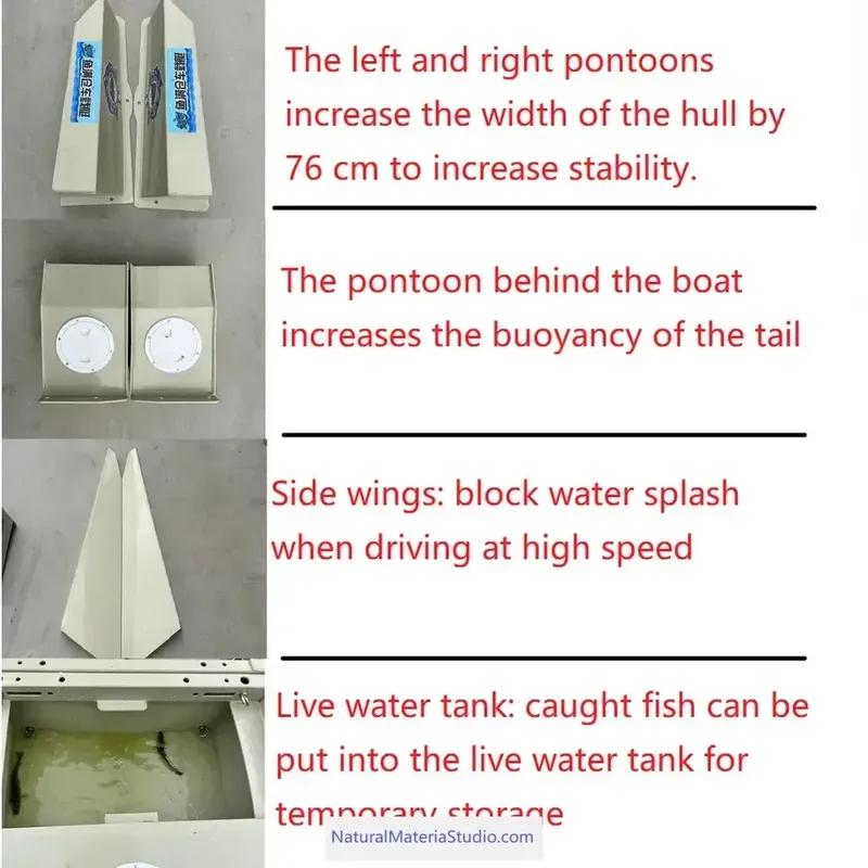 저희 보트는 고품질 PPR로 제작되었으며, 스테인리스 스틸 인레이 콜라겐 선체로 보강되고 다양한 금속 부속품과 결합되어 있습니다. 이 소재는 보트를 가볍고 유연하며 견고하고 내구성 있게 하며, 수명이 30년 이상입니다. 보트는 특별히 밀폐된 선실로 설계되어 보트가 뒤집혀도 침몰하지 않습니다. 완전 재활용 가능하며 수리가 용이합니다. 고객은 보트 크기에 따라 엔진을 직접 구성합니다(현지 전문 매장에 문의).